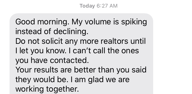 Not only has he closed deals and gotten referrals every week, but he has more time freedom and more mental bandwidth. Previously, he was making a ton of calls himself and he found that it was affecting his mindset when he made all those cold calls and he wasn't able to tackle the rest of his day 100%. Now the calling is hands off, and now he only talks to realtors that are open to talking with him from the meetings we had set for him.